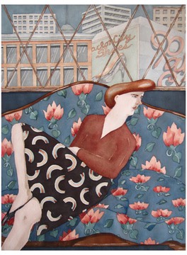 When Suzie lived in Binghamton, New York, she had a light-filled studio located in an old industrial building, serviced by a massive freight elevator. It was on the third floor, as I recall, and a sculptor was just down the hall. Binghamton was known as the "Parlor City" years ago, and a distinctive downtown landmark was this particular shoe store featured in Suzie's large watercolor. Sort of a turquoise blue, it stands out both on the street and as an element in the painting. With only a little bit of artistic liberty, this is the view from her studio, right next to the Chenango River, looking at the city center of Binghamton. - Thomas Kelsey